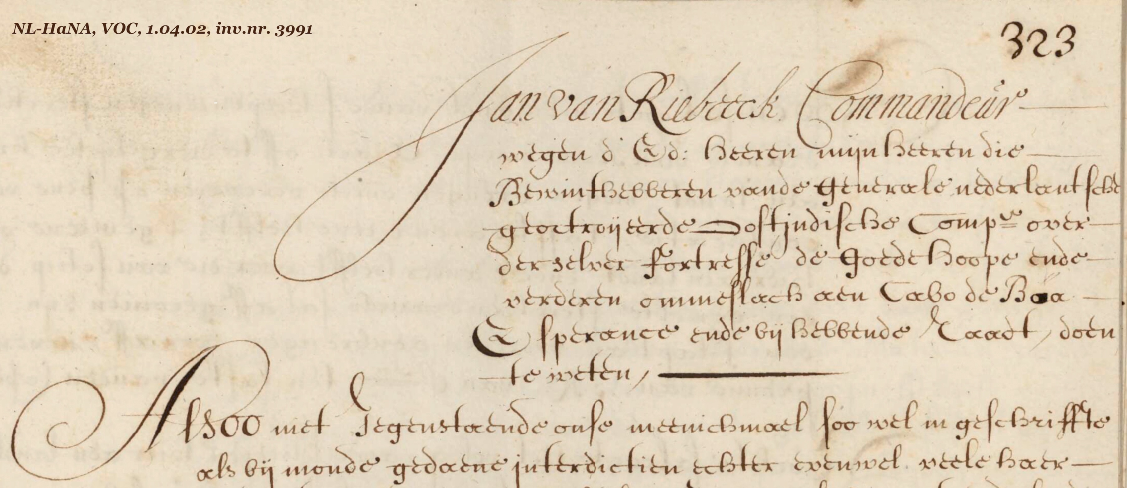 | 1...9 | Originele missive door den Commandeur Jan van Riebeeck en Raedt aen d' Vergaderingh der Heeren Seventhiene in dato 5 Meert anno 1657 geschreven | 21 |